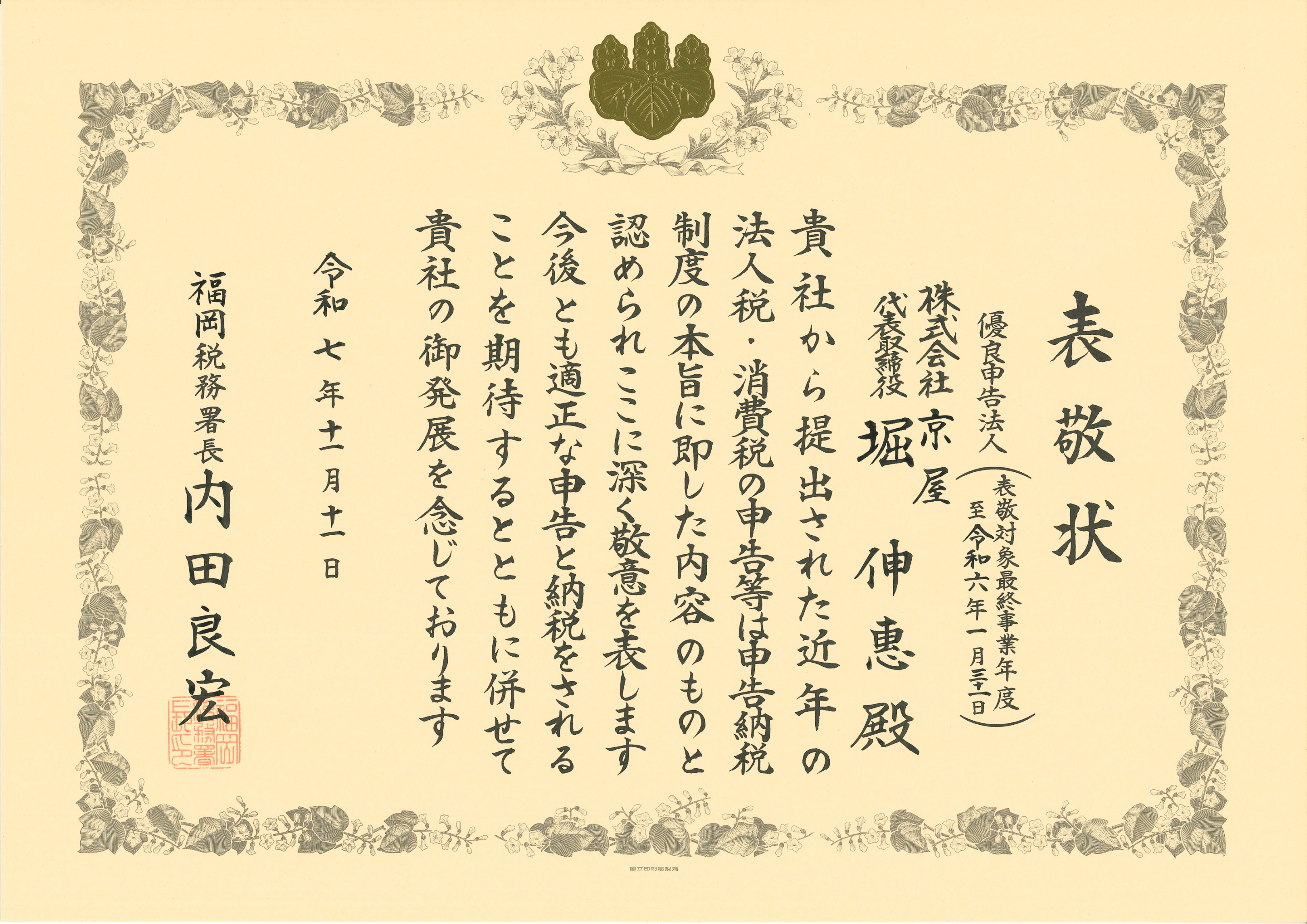 この度、弊社は、長年にわたる適正な申告と納税の実績、および良好な経理処理が評価され、福岡税務署より